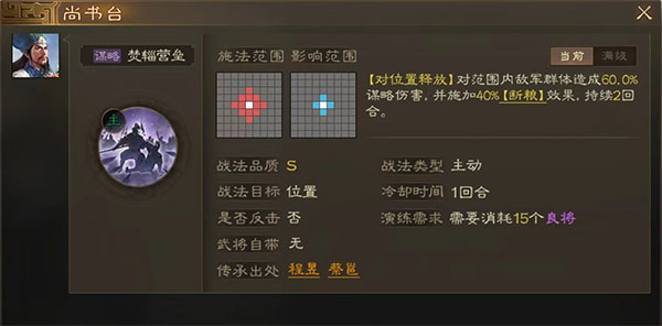 3、在其他属性方面,无论是统率、政治还是魅力,都是超一流武将水准,可以说现在推出的角色中诸葛亮绝对是整体属性最高的一个。比关羽,张飞,马超甚至是吕布都要优秀,使得诸葛亮无论是在战场上还是内政中都是最出色的一个。接下来看一下自带战法神机妙算,使用之后可以选择一块范围,对里面的敌军造成谋略伤害,并且安放一个八卦阵。八卦阵影响两格范围所有被阵法所笼罩的敌人,一旦释放主动战法都会受到反噬伤害,而且对方战法的冷却时间增加。