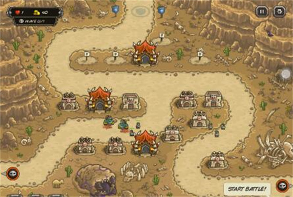 攻略:本关的重点在于死守中央路口,初始布局建议左侧弓箭塔,魔法塔;中下部弓箭塔,炸弹塔;右侧弓箭塔;中部步兵塔,弓箭塔(参考图片一)。有资金后在中部补充1座弓箭塔,1座步兵塔以稳固中央防守,增援还是冷却就用。然后升级,本关的塔可以升1级,优先升级中央的步兵塔,然后是左侧的魔法塔,再后是中央的弓箭塔和中下的炸弹塔。本关二级沙漠兵较多,在其于中央集中时用火雨。后期可酌情在后方补箭塔,总的来说本关难度不大,我通关时还有600多金。