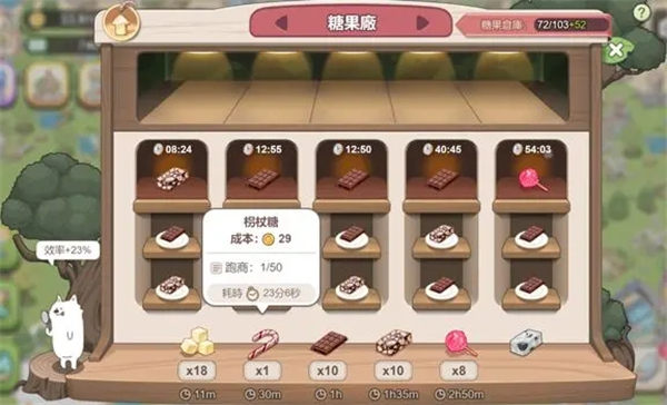 解锁工厂后,初始有1种食物可以生产,等级树升级可以解锁更多食物。点击底部的食物或将食物拖动到生产格子上,即可进行生产。长按食物可以查看到单个食物所需成本、消耗时间、存量、当前跑商所需数量。