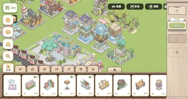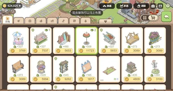 点击“多选”按钮,可以选中多个装饰集体移动,甚至连地砖也可以一并转移,非常适合范围布局。旁边的“消除”按钮,可以将多个装饰合并消除,一步到位的便利操作。