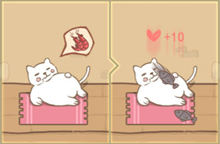 点击气泡就可以进行喂食,吃饱后猫咪会支付一笔小鱼干。