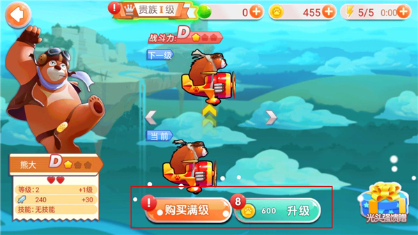 4、开始游戏后,玩家需要控制熊大和宠物飞行,并在飞行途中击败迫害森林的怪物,也可以使用道具帮助熊大闯关,注意闯关时可领取途中的水果帮助玩家保持体力。