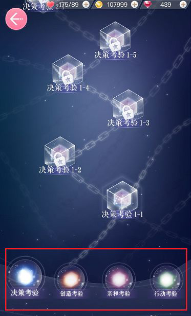 3、每个人物试炼又分为决策考验、创造考验 、亲和考验和行动考验,选择所要进行的考验种类,并点击需要通过的关卡。