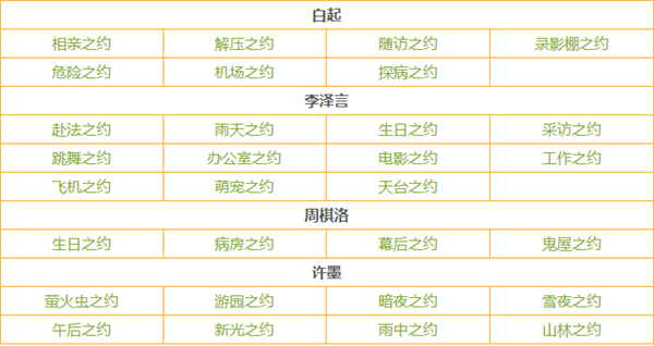 在了解完四位男神的基本信息之后,想必各位太太最关心的莫过于是和心仪的对象来一次甜蜜的约会吧,为此,小编将他们的约会条件整理到了一起,方便各位太太查阅。