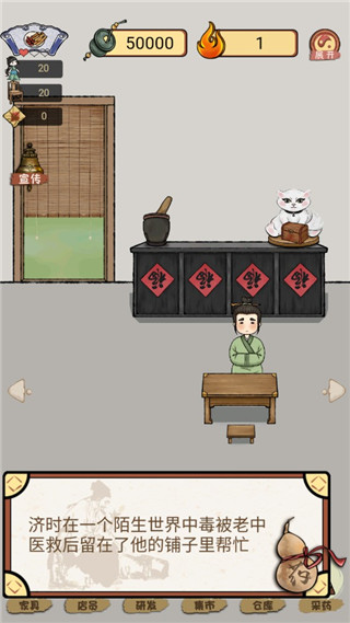 2、进入游戏后,玩家在一个陌生世界中毒被老中医救后留在了它的铺子里帮忙。