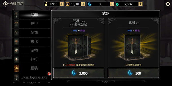 2、卡牌商店中提供了多种类型的装备抽取,【消耗水晶】即可抽取各类武器装备,十连抽必得高级装备。