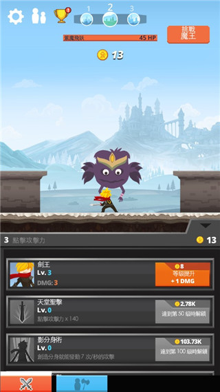 1、【疯狂点击 无畏闯关】游戏省去各类繁复的操作,只需快速点击屏幕,剑圣便会频频出招,解决入侵的怪物!英雄的攻击取决于你点击的速度,面对关卡BOSS,记得全力出击!