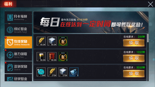 各位总督只要每天在线达到一定时间,即可领取大量经验和资源道具奖励,更有钻石获取哦!