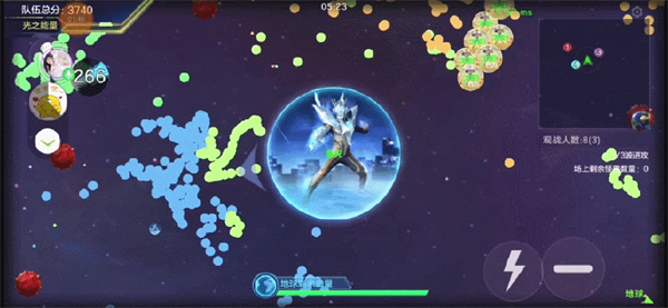 4、【速分法(快速分身法)】(自创)虽然此技术可以惯用减号分身达到快速的效果,但是分身也是有个度的。在团队模式中,当你的体重大于你的球友分身,你分出来的分身体重也大于球友,这时点击减号,往后拉(不使用往后拉前面分的身会被敌球所吃掉,达不到配合)本技术教程完毕。