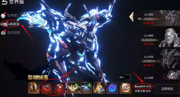 最后一种其实很简单,但也是最危险的,因为需要进入世界服天空岛去击杀boss(也就是跨服地图),你每天可进入天空岛击杀5次boss,因为boss疲劳为5次,但你要想想,所有区服的玩家都想进入跨服来获取原初装备,你可以想象那种场面,肯定是要面临杀戮的,所以进入该地图要么组队或者军团集体进入,才会保险一点。