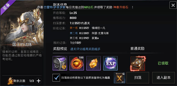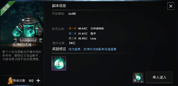 女神的试炼副本6分钟,会刷出非常非常高的经验,这个每天一定要把次数买满,而且不能找回,不然经验损失会很大,注意这个副本尽量在每天战力极限的时候在打,战力高的话,获得的经验也越高。