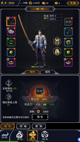 玩家点击左下角人物,再点击下方强化即可进行装备的强化升级,提高自身实力。