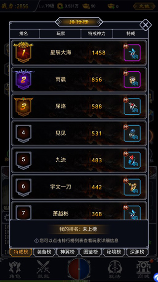 玩家点击屏幕右边排行榜,即可查看排行榜的人物,有特戒、装备、神翼、图鉴、秘境、深渊六个榜单,点击玩家名字还可以查看上榜玩家的信息。
