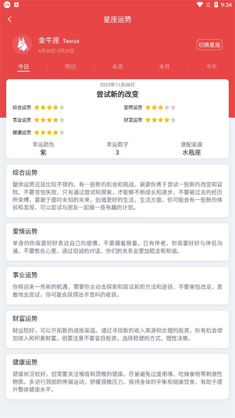 界面也很棒,简洁又有中国特色,不会让人觉得繁琐。虽然我不太相信星座运势,但查日期和节气确实很方便,规划行程也更有依据了。