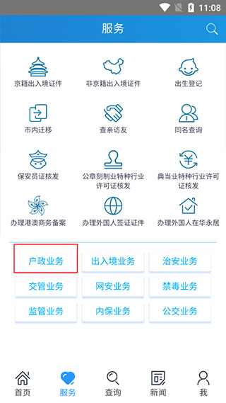 4、选择户政业务后。我们往下滑找到办理居民身份证,根据你需要的服务联系,选择相应的服务,例如居民身份证领取、居民身份证丢失异地补办领取或者是北京市首次申领居民身份证。