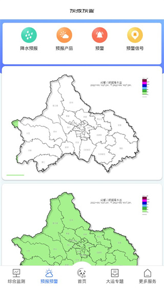 基于公众版本功能,为决策用户以及专业用户提供国家级、省级、市级指导预报产品、数值预报分析产品、预报产品、溃变图;提供成都市级预警以及市级、区县级气象预警信号查询功能。
