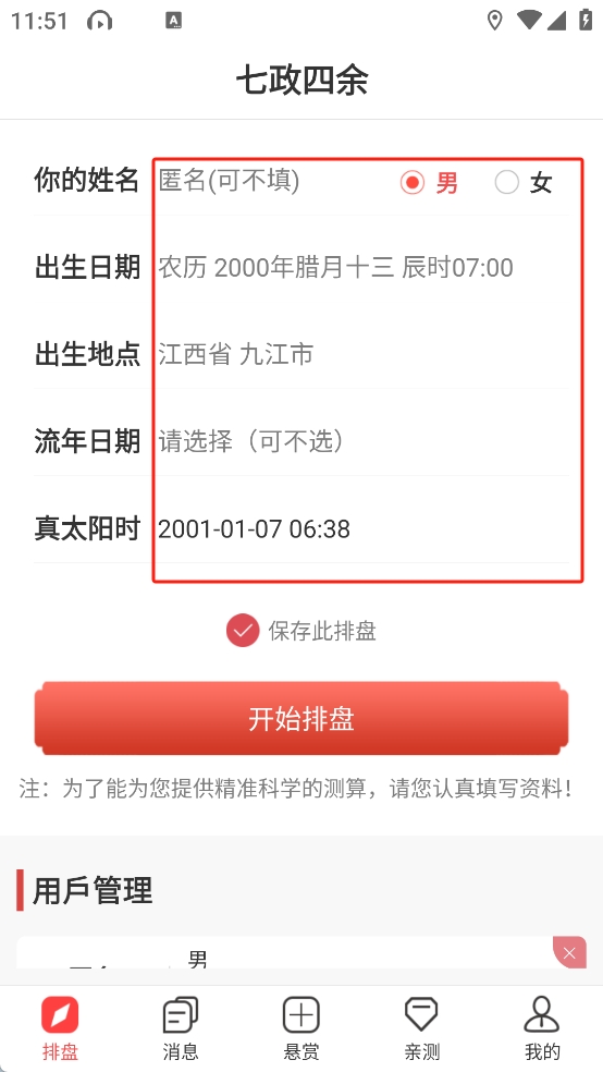 1、在本站下载安装并打开七政四余排盘App,进入应用,是新用户需要登陆,然后在首页填写自己的相关信息然后点击开始排盘。