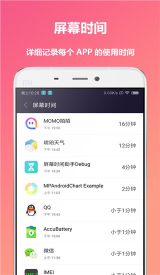 1、屏幕时间助手,记录手机使用详情及趋势2、屏幕时间,详细记录每个APP的使用时间