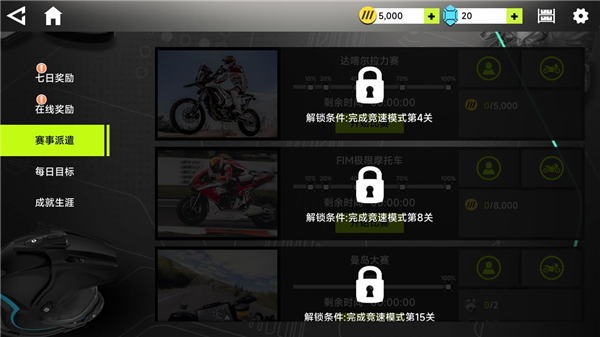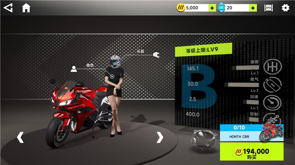 2、点击车库,可以用比赛获得的金币购买不同类型的摩托车。