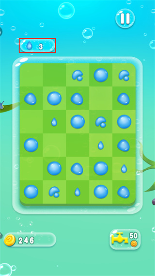 5、游戏上方的水滴数量,玩家需要在水滴消耗完前将关卡中的水滴都弄爆;