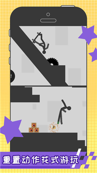 3、滑动火柴人从楼梯下落,在空中做出各种动作,火柴人和楼梯的碰撞,非常的解压