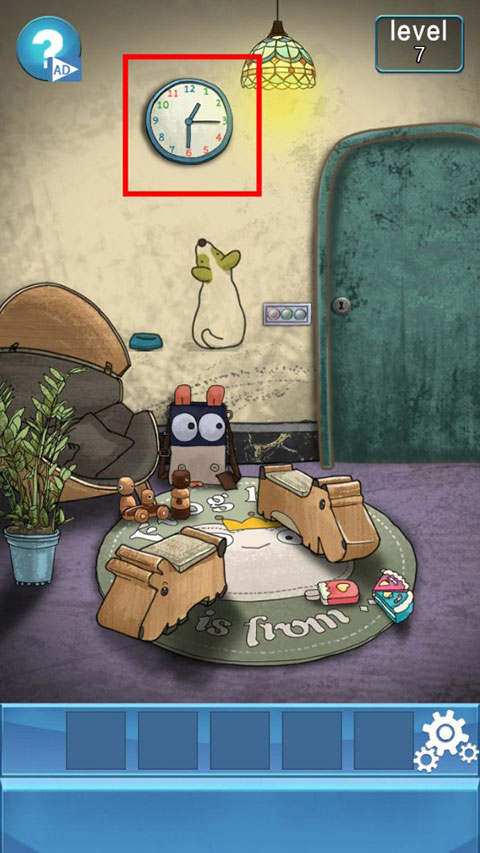 查看门锁,根据墙上时钟的信息得到提示绿绿绿粉粉粉蓝蓝蓝绿粉蓝,依次按下按钮开门。