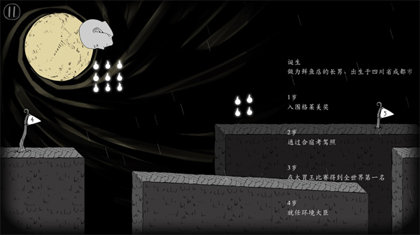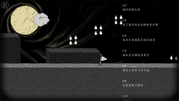 右边屏幕还显示头颅的每个年龄所发生的事件,头颅一旦滚到一段距离就会增加一岁并随机发生事件。