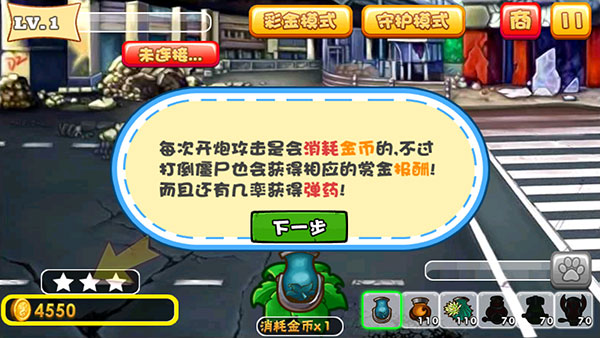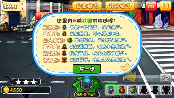 1、这里有6种武器供你迭择。豌互炮:百发射一粒豌互。攻击僵尸。