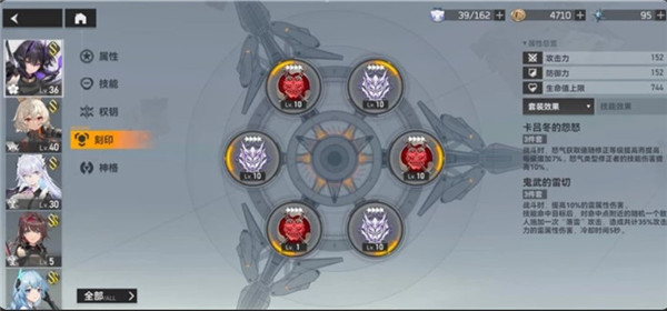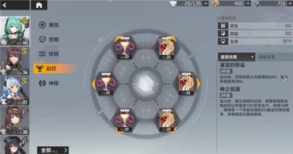 雏心:刻印选择屠龙的歌谣3件套和神之祝酒3件套,前者效果是在战斗中奥义充能获取速度增加,并且奥义伤害值增加;后者效果是战斗中在每一次消耗印记后就有概率回复印记并且提高一定的攻击力,而且在每次释放一次技能之后回复印记的概率也会增加。雏心的刻印可以增加其大招的伤害值,让雏心的能力大大增加。