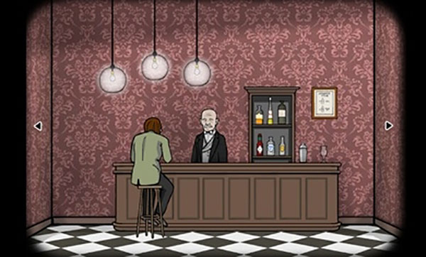 9、接着根据提示再调一杯酒「1×VODKA、1×TABASCO、2×BLOOD(血)」,递给男人后开枪自杀,点击枪洞,先走左边,沿途收集到3个「方块」,从左边出来后再次进去,这次走右边收集到1个「方块」,在右边有一个密码箱,暂时不用管。