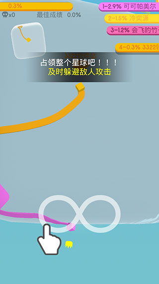 6、学会以上技巧后就开始占领整个星球吧,注意及时躲避敌人攻击,右上角显示的就是玩家占地面积的百分比和排名,左上角是星球的地图模型。