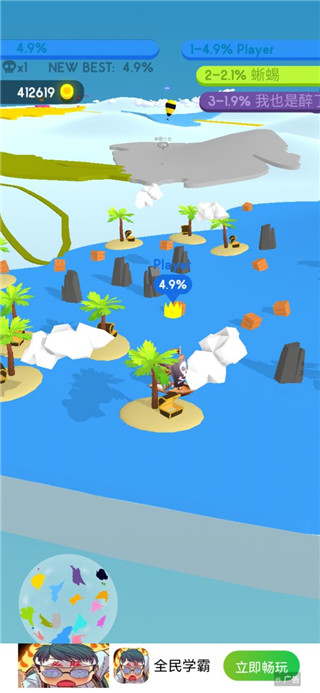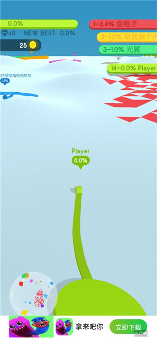 开局一据点,地盘全靠抢!本次小编为大家带来的是圈出一块地最新版,这是一款io类的竞技手游,游戏在画面上采用了3D卡通风格,游戏简单有趣,画面精致清晰,玩法丰富,在这里玩家开局只有一个很小的据点,需要通过操纵一个从据点中跑出来的小方块,不断的让方块画出跟据点一起的闭合圈圈,圈到的地就会变成自己的颜色,也就是自己的地盘安利,圈得越多,胜利就离自己越近!同时在圈出一块地最新版游戏中玩家在扩张的时候需要注意不要被敌人碰到没有链接完整的线,否则游戏会结束。除此之外,在圈出一块地游戏中还对应加入反吞并机制,可以割地吞并敌人,也会被敌人撞击摧毁移动留下的割地虚线,从而直接退出割地竞争。以割地时的移动操作诠释技,以领地多寡和生死诠释竞,要么竞技得胜,要么退出竞争,非常残酷。计算得分时,利用反吞并机制消灭敌人的得分,甚至是割地得分的三倍有余。喜欢的玩家还在等什么,快来下载体验一下试试看吧!