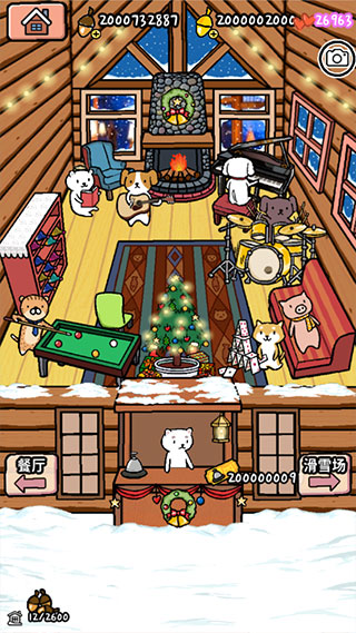 4、点击左侧的箭头到山庄里,这里可以为想要休息的动物们提供一个休闲温暖的场所,点击前台就可以邀请更多的动物来滑雪场。