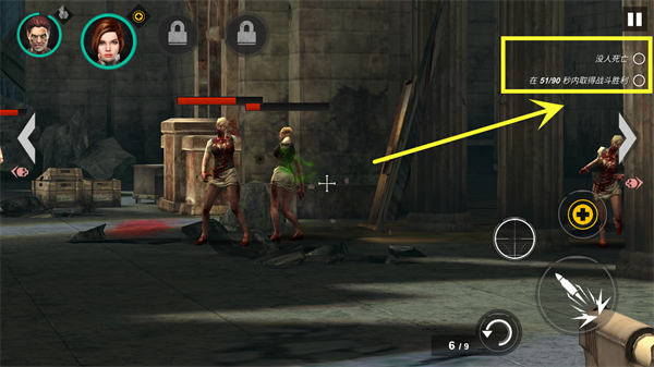 4、游戏基本操作很简单,按住左边屏幕移动可以进行视角转移,将屏幕中间的十字瞄准对准僵尸,然后点击右边射击即可击杀僵尸。