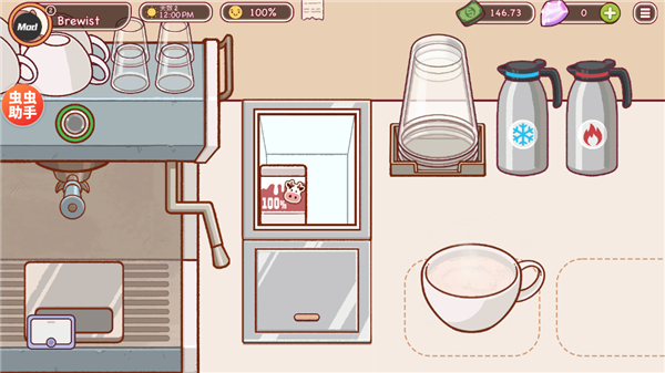 游戏里有超多有趣的设定:比如你可以装饰店铺、升级设备、解锁新配方,甚至还能体验到真实的咖啡制作过程。最让我喜欢的是它内置了金币和钻石功能,玩得开心的时候可以开 cheat 快速推进进度,但其实不开也没关系,慢慢来也能体验所有内容。
