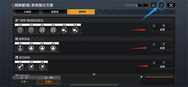 当然,我们也可以将自己认为优质的加点方案分享出去供他人使用效仿点击蓝色箭头所指的图标分享即可,并且,不论是分享出去的方案还是自己编辑的方案,都可以在单一的一项强化系统中独立使用。(如红色箭头所指)可以只使用部分系统加点方案。