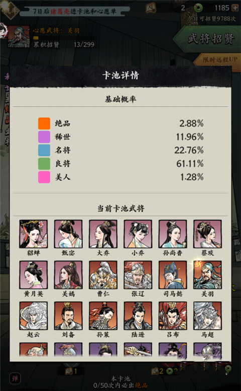 1、在这些卡池中,不同的人物都会有不同的品质,其中品质越好的自然就会越难获取了。而此处每个玩家还能设定一个心愿武将,在设定好之后,你们能够抽取到它的概率会更高一些。