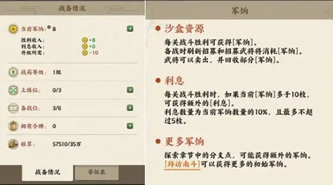 在备战阶段,点击左下方的【战备】按钮,可以查看当前战局的战备信息。其中包含当前拥有的军饷、战局等级、上阵位数量、备战区数量、令牌、粮草等信息。点击军饷后可以查看军饷的获取途径和利息计算规则。