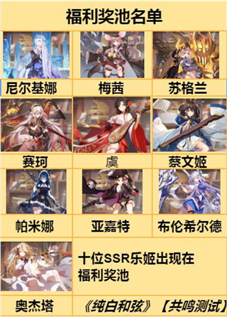 目前福利奖池能抽的的SSR乐姬有:尼尔基娜,梅茜,苏格兰,赛珂,虞,蔡文姬,帕米娜,亚嘉特,布伦希尔德,奥杰塔。十位SSR乐姬(目前是这样后续可能会有改动)