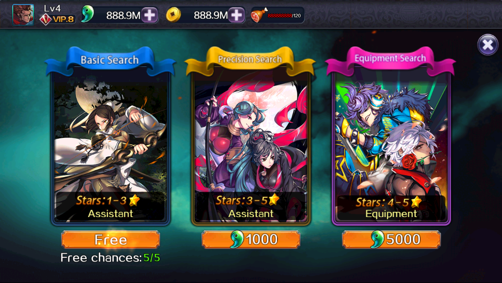 副将有两种搜索方式,一种消耗金币只能搜索1-3星的副将;一种消耗蓝玉能搜索3-5星的副将。5星副将的成长好的令人发指,和4星副将都是不在一个次元的。特别是五星MM,那可是梦寐以求的存在啊。