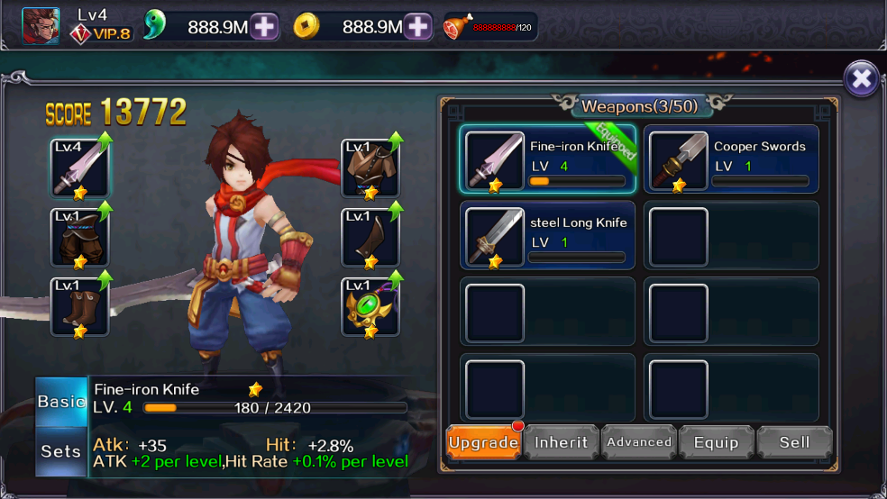 锻冶石一般是过关后开宝箱能得到,一般宝箱只有LV1和LV2的锻冶石,LV3的估计后面关卡会有。LV3-4的石头我是用商店内购抽来的。而且一星武器大多只有3次升级机会,而后面星级越多升级次数越多(商店购买的四星武器不能升级),注意武器有武器槽,一开始只有3个槽,不用蓝玉解锁只能选择抛弃武器,其实前期的武器到后期基本无用,所以抛弃也就抛弃了。
