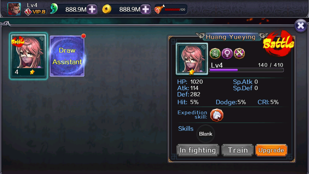 每场战斗可以携带一个副将。副将可以说是另一个可控角色,有单独的血量条,能抗能打。副将都有自己的独有武器及技能,而且部分副将还有远程攻击能力。游戏一开始只有一个一星副将黄月英,然后随着游戏的发展你可以搜索副将,第一次教学搜索不消耗钱和蓝玉。