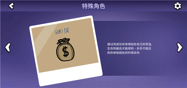 肉汁:通过完成任务来增加你的赏金,生存到最后才能得到,杀手只能在和你单独相处的时候杀你。