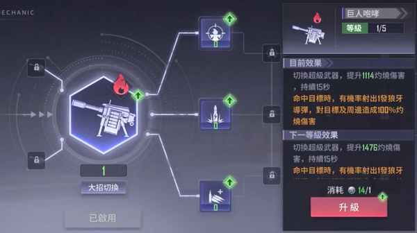 火属性。 提升灼烧伤害,命中目标时有概率会发射一枚导弹,对目标及周边造成灼烧伤害。