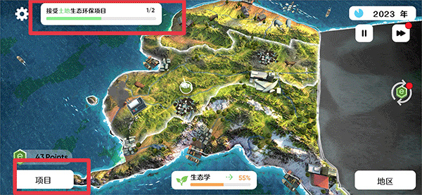 4、屏幕的左上角会显示目标任务,按照要求完成目标任务,例如接受土地生态环保项目,点击右下角项目;