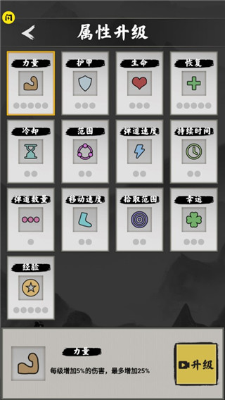 5、游戏中属性有力量、护甲、生命、范围、移动速度、幸运等等不同的属性,玩家可以根据自己的需求进行升级,可以帮助玩家在游戏中可以更快的获得胜利。
