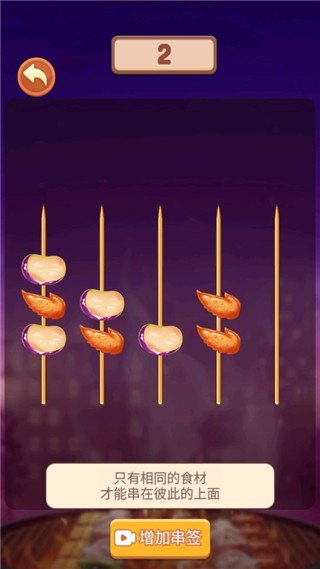 6、只有相同的食材才能串在彼此的上面,玩家可以增加串签;