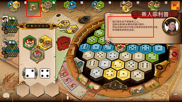 3、你也可以直接点按另一个仓库或使用箭头。点数与选定仓库编号最相近的骰子被自动选中。界面上也会显示是否有任何工人需要使用这颗骰子。