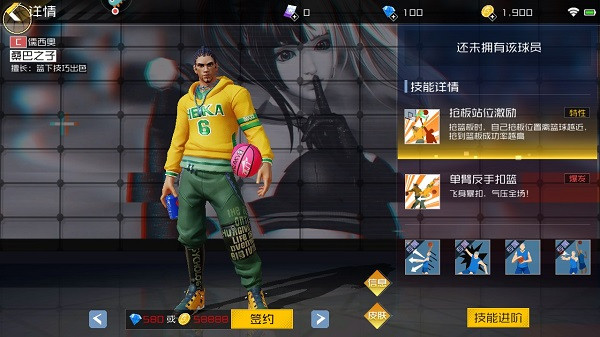 3、该角色可以通过首冲获得,其属性不难看出相当灵活,尤其是90点的篮板属性,所以在实战中尽量保证在篮下阻截对面中锋的投篮,再加上特性技能的效果,可以在盖帽失败的时候,也能继续起跳参与篮板球的争夺。