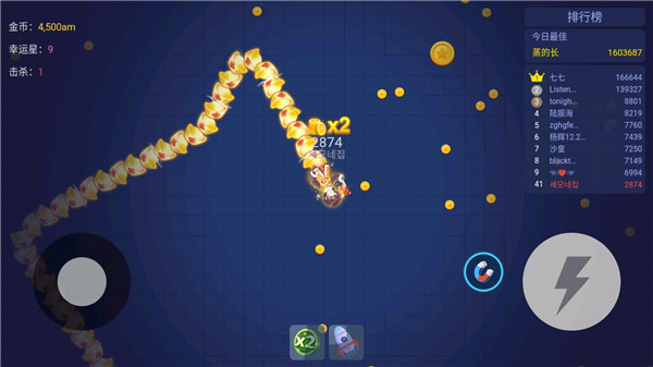 1、控制摇杆走位,吃掉地图上金币,就会变长。
